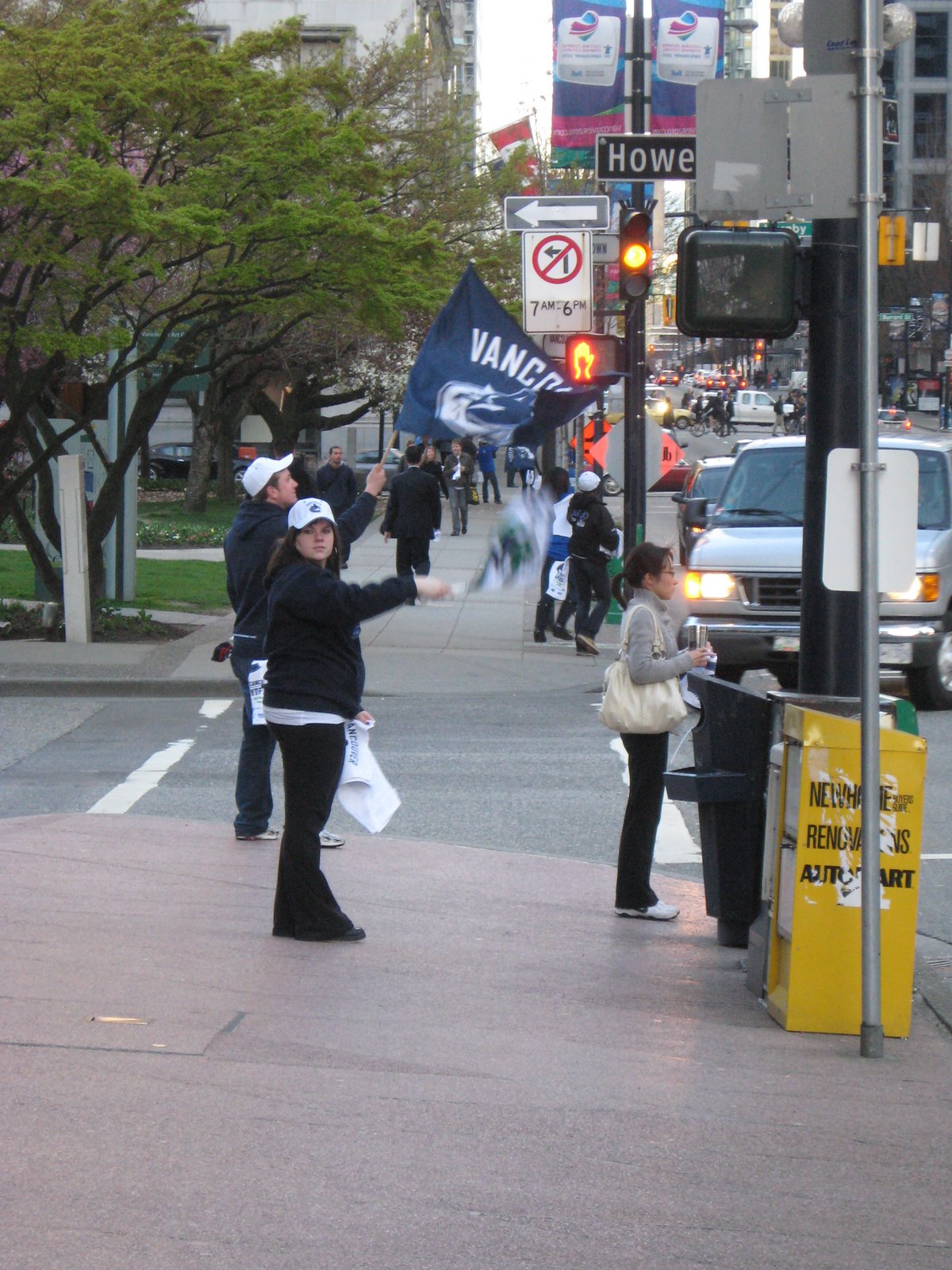 Its official, the playoffs are here. This morning at my 7am walk to the gym, I discovered that Canuck Fans have hit the streets early, waving flags and handing out hand towels with the Vancouver Canucks Logo in support of our city’s hockey team. Many a horn honked their support while I stopped to take a picture.