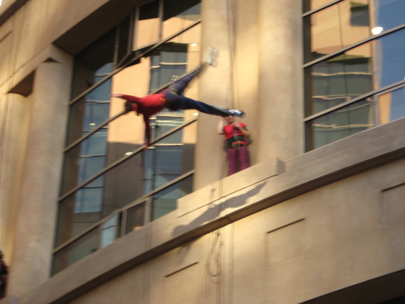 This post is a bit delayed, I really wish I’d known about it ahead of time. I saw this “rehearsal” on the way to a friends place on Monday October 5th. I think its pretty darn amazing. The director was lying down on the ground with a megaphone shouting directions at the aerial acrobats, and a sign said something about Gargoyles. I’m not sure what the rehearsal was for, but I wanted to know the freedom that they must have felt as they bounded off the Vancouver Public Library. I know its the type of stunt that requires months, if not years of training, but I wished I knew their abandon anyway, dancing on the sides of the building. Even if I had the ropes in place, I’d probably be scared out of my mind, but the slow ballet-like moves took me into another world. It seemed graceful, elegant and easy. I can only imagine what kind of music would be put with this choreography. Beautiful, if I get a chance, I’ll watch it again. I hope you enjoy the magic too.