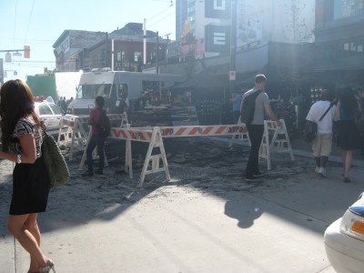 Yes, Fringe was back in town filming, and no I did not see Joshua Jackson. But that’s Anna Torv’s (Olivia’s) hair in the filming shot.